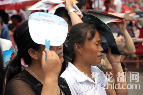 一考生家長拿著宣傳單遮陽。(戚永/攝)