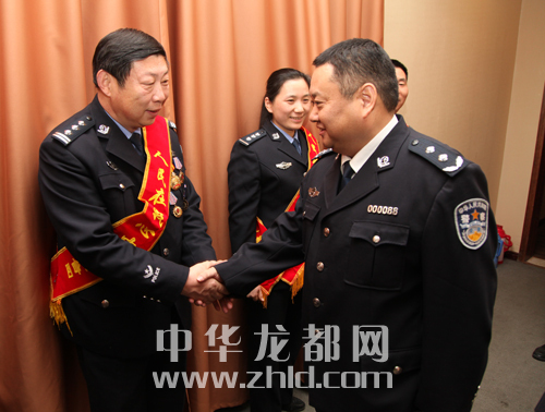 市政府黨組成員、公安局長姚天民會見報(bào)告團(tuán)成員。