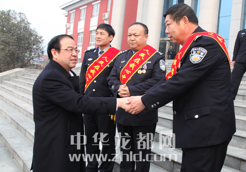 ????報(bào)告會前,周口市委常委、政法委書記朱家臣,副市長劉國連,市政府黨組成員、公安局長姚天民親切會見了報(bào)告團(tuán)成員并合影留念。