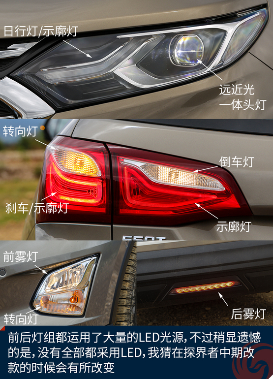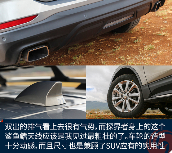 外觀上令我印象深刻的地方有這么幾個(gè),首先前后燈組都運(yùn)用了大量的LED光源,不過(guò)稍顯遺憾的是,沒(méi)有全部都采用LED,我猜在探界者中期改款的時(shí)候會(huì)有所改變。四個(gè)車門(mén)下部包邊的設(shè)計(jì)能夠減少下車弄臟褲腿時(shí)的尷尬。車頂?shù)男欣罴苷娴目捎?,而且?jù)說(shuō)早期購(gòu)買探界者的朋友還能獲得車頂?shù)男欣钕洌謱?shí)用。雙出的排氣看上去很有氣勢(shì),而探界者身上的這個(gè)鯊魚(yú)鰭天線應(yīng)該是我見(jiàn)過(guò)最粗壯的了。車輪的造型十分動(dòng)感,而且尺寸也是兼顧了SUV應(yīng)有的實(shí)用性。