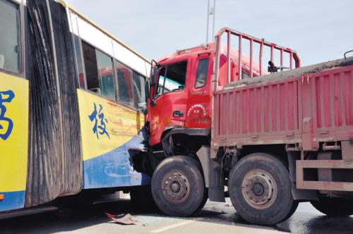 ????????記者觀察到,大客車側(cè)面寫有“交通駕?!币恍写笞?,車頭朝西車尾朝東停著,右側(cè)車身被橋墩緊緊卡住;運(yùn)水罐車長(zhǎng)近20米,車身與大客車車身幾乎呈90度直角,運(yùn)水罐車車頭撞在大客車的左后側(cè),將大客車撞癟了。事發(fā)地點(diǎn)位于橋坡處,地面遍布七零八落的玻璃碎片,運(yùn)水罐車下面還有少量血跡。運(yùn)水罐車和大客車內(nèi)均空無一人。