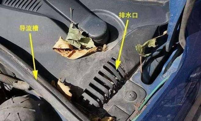????????位于發(fā)動機艙和擋風玻璃之間的發(fā)動機艙排水孔,如果經(jīng)常有樹葉樹枝掉在這個地方,就容易造成這排黑色格柵上的排水孔堵塞。