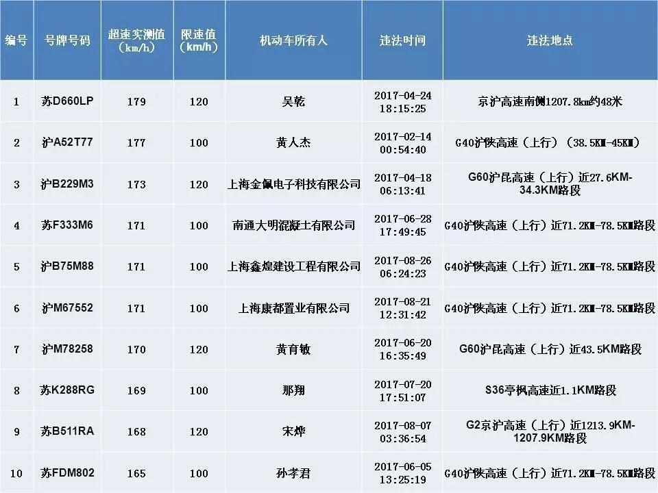 ????中青在線上海9月12日電(中國青年報 中青在線記者 王燁捷)上海交警今天公布今年以來“前五十”機動車超速違法名單,最高時速竟達179km/h。
