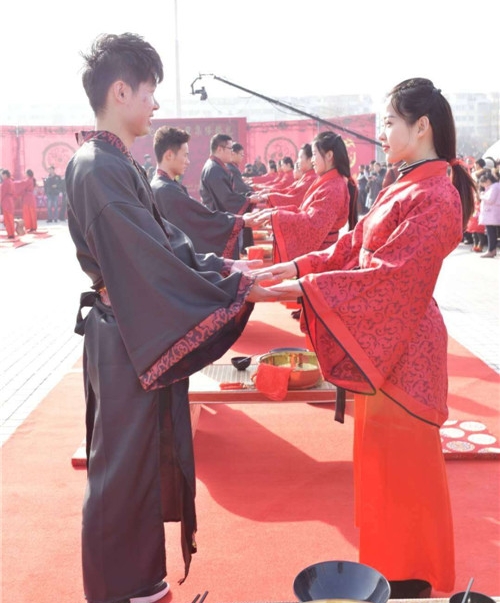 記者在現(xiàn)場(chǎng)看到,16對(duì)新人在司儀的引導(dǎo)下,采用中國(guó)古典婚禮儀式,有牽紅線、結(jié)發(fā)、拜天地等程序,儀式簡(jiǎn)單而隆重,新人家屬、1000多名市民圍觀見證了新人喜結(jié)連理。
