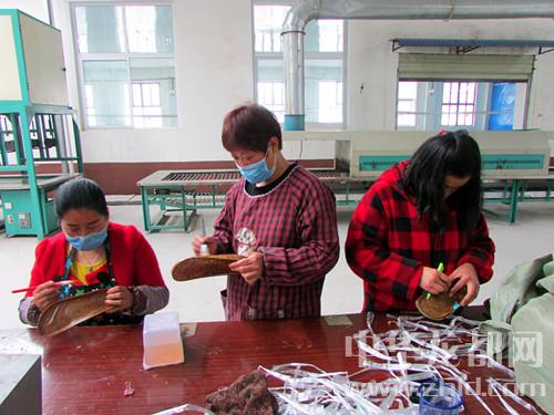 卞路口鄉(xiāng)高山店村的一家鞋廠,留守婦女正在加工鞋底。該縣在扶貧攻堅中,通過實施資金幫扶、技術培訓等措施幫助貧困群眾、返鄉(xiāng)農(nóng)民工創(chuàng)辦玩具廠、制鞋廠等微型企業(yè),為周邊群眾提供了就業(yè)崗位。