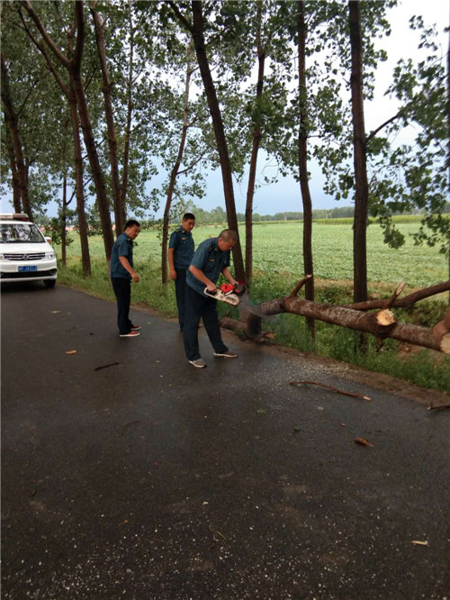 在東夏看張立交橋、李莊橋處,多棵行道樹被大風刮倒,大量枝掉落在公路上,嚴重危及行車安全和道路通行,執(zhí)法人員立即冒雨采取安全防護措施,并利用車載應急搶險工具將倒塌在公路上直徑為10-20cm的樹木進行及時清理,并對殘枝落葉進行了全面清掃。歷時三個小時,及時地消除了道路安全隱患,保障人民群眾的出行安全。