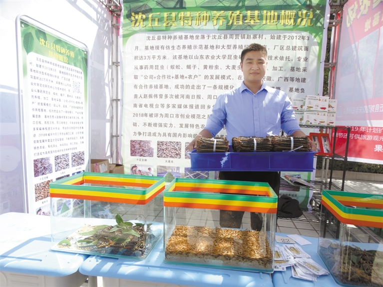 9月22日,沈丘縣舉辦第一個中國農(nóng)民豐收節(jié)慶?;顒?,來自全縣22個鄉(xiāng)鎮(zhèn)(辦事處)的35家農(nóng)民種植、養(yǎng)殖合作社和家庭農(nóng)場,展示了槐山藥、黃金梨、冬棗、木瓜、“袖珍”黃瓜、活體蜈蚣、蝎子等120余個品種。