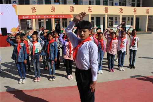 神圣而又雄壯的國歌響起了。孩子們瞪大了眼睛,小擎旗手猛地甩出臂膀,將耀眼的五星紅旗撒在陽光下,全體孩子們行少先隊隊禮,注視著國旗冉冉升起。孩子們的歌聲越來越嘹亮,直到最后還在高喊:“前進,前進進……”