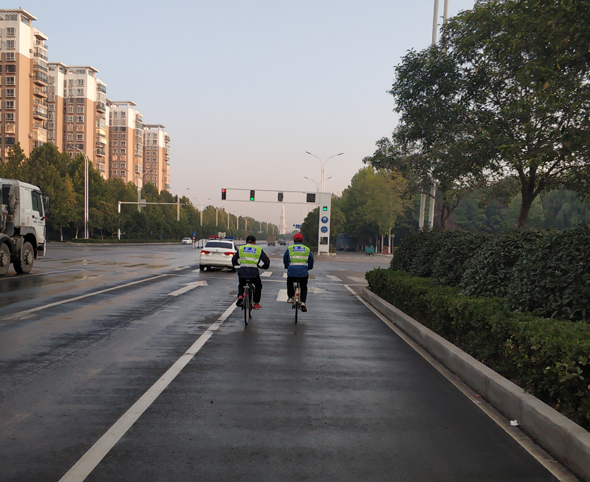校準(zhǔn)后,袁林教授騎著自行車,在周口馬拉松組委會(huì)一名工作人員的騎行陪伴下,在交警駕駛警車引領(lǐng)下,從周馬起點(diǎn)出發(fā),緩緩前行,開始對(duì)賽道距離進(jìn)行具體測(cè)量。每到一公里處,袁林教授都要停下來一次,采集數(shù)據(jù)。周口馬拉松組委會(huì)工作人員隨即在測(cè)量確定的每一公里處做標(biāo)記。
