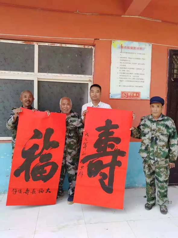 鄲城縣衛(wèi)計(jì)委駐虎崗鄉(xiāng)虎崗行政村第一書記王忠樸,是鄲城縣書法協(xié)會(huì)副主席兼秘書長(zhǎng),在他的牽線下,鄲城縣書法協(xié)會(huì)主席巴云山帶領(lǐng)10多名書法協(xié)會(huì)會(huì)員前來(lái)助陣,與敬老院里懂書法的老人一起揮毫潑墨。