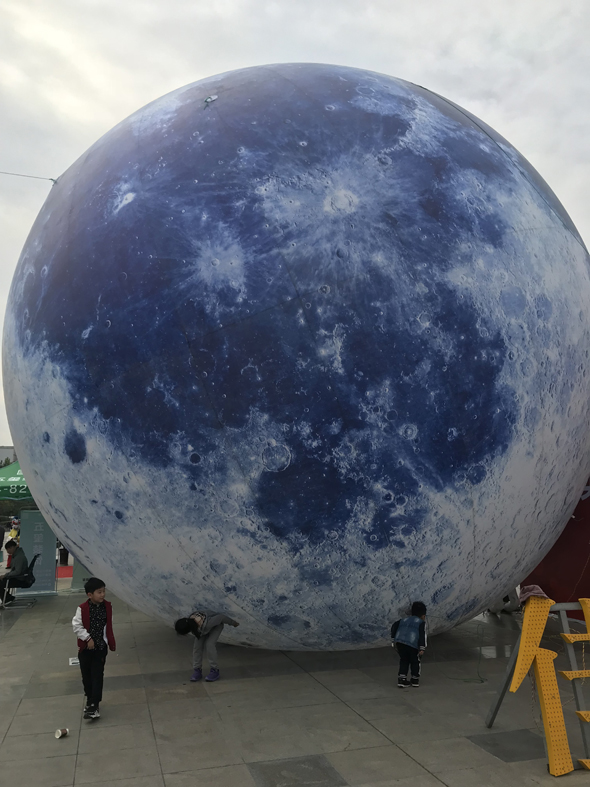 記者在現(xiàn)場(chǎng)看到,這個(gè)“大月亮”塊頭很大,擺放在展廳前。前來參加展會(huì)的市民紛紛拍照,有的市民還把它發(fā)到微信朋友圈,稱“周口有個(gè)超級(jí)大月球”。