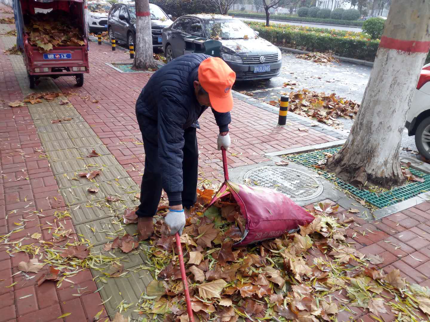 12月3日晚上,周口市中心城區(qū)風急雨驟,樹葉落了一地。4日上午天放晴,環(huán)衛(wèi)工人紛紛上街清掃落葉。負責興旺路的環(huán)衛(wèi)工人告訴記者,他以前兩個小時就能打掃完,而當天他干了3個小時還沒有干完,估計還得再干1個多小時。圖為環(huán)衛(wèi)工人在清掃落葉。