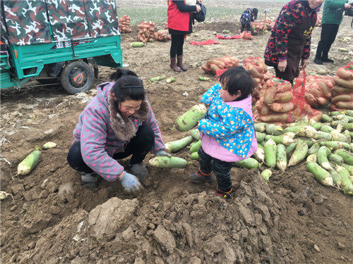 走在淮陽縣劉振屯鄉(xiāng)張老家村的田間地頭,記者看見劉玉梅正將蘿卜從地里扒出來裝車,她的小侄女也幫起忙來,吃力地抱起了一個(gè)大蘿卜。 記者 王凱 攝