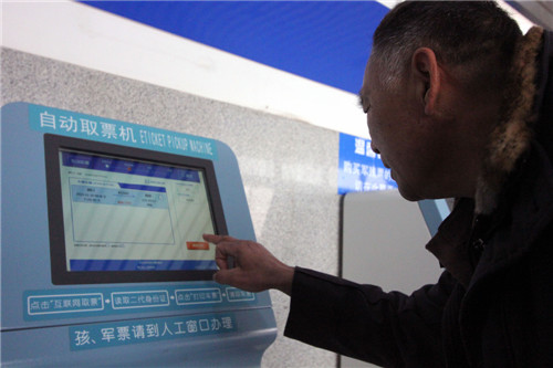 1月20日,旅客在周口火車站自動(dòng)售票機(jī)取票。記者 金月全 攝
