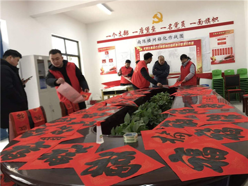 臨近新春佳節(jié),淮陽(yáng)縣多家單位邀請(qǐng)書(shū)法家深入結(jié)對(duì)幫扶村開(kāi)展新春送"福"到農(nóng)家送春聯(lián)活動(dòng),一幅幅春聯(lián)翰墨飄香,讓群眾贊不絕口,一幅幅春聯(lián)送去新春的祝福,讓原本寒風(fēng)凌冽的冬日變得溫馨、喜慶。圖為縣住建局組織書(shū)法愛(ài)好志愿者在朱集鄉(xiāng)南陳樓開(kāi)展送春聯(lián)活動(dòng),志愿者現(xiàn)場(chǎng)揮毫潑墨,書(shū)寫(xiě)新春對(duì)聯(lián),受到廣大群眾的歡迎。