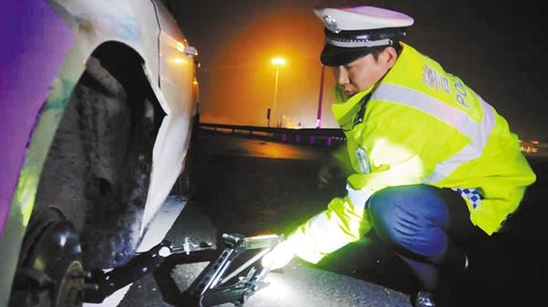 當(dāng)日21時許,市公安局交通管理支隊七大隊民警王凱偉和同事巡邏至機西高速129公里周口方向時,發(fā)現(xiàn)一輛白色福特轎車停在應(yīng)急車道上,車輛后方擺放有警示標(biāo)志,一男子蹲在車旁不知所措。見狀,王凱偉立即安排輔警柴袁龍在來車方向做好安全防范,自己下車查看情況。