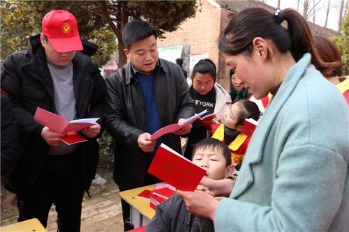 上午8時(shí)許,在新店鋪小學(xué)一棟教學(xué)樓前,前來參加活動的志愿者早已趕到,會場也已布置完畢。30多名身穿紅色馬甲的志愿者在會場中忙碌,排練節(jié)目、整理書包,向前去參加活動的村民和學(xué)生講解《志愿服務(wù)條例》和法律安全知識等。