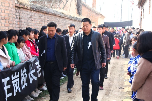 院內(nèi)正廳上方,懸掛著黑底白字的橫幅“沉痛悼念王崗?fù)尽?,院外道路兩?cè),擺滿了人們敬獻(xiàn)的黑紗、花圈。市教體局領(lǐng)導(dǎo)來了,縣政府副縣長肖煒來了,縣教體局局長劉現(xiàn)營來了;局黨組成員、各鄉(xiāng)校校長來了,王崗最愛的學(xué)生、同事來了;學(xué)生家長也來了……大家胸佩白花,向這位愛崗敬業(yè)的基層校長表示崇高的敬意和深切的哀悼。
