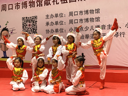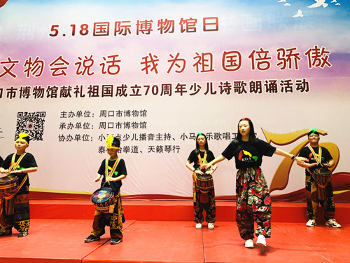 5月18日國(guó)際博物館日當(dāng)天,周口市博物館舉行系列主題活動(dòng)“如果文物會(huì)說(shuō)話(huà),我為祖國(guó)倍驕傲”詩(shī)歌朗誦活動(dòng)、文物繪畫(huà)作品展活動(dòng)。在活動(dòng)現(xiàn)場(chǎng),小朋友們帶來(lái)了精彩紛呈的節(jié)目,有根據(jù)市博物館的文物創(chuàng)作的詩(shī)歌作品《文物會(huì)說(shuō)話(huà):漢代玉豬》《文物會(huì)說(shuō)話(huà):戰(zhàn)國(guó)青龍玉佩》,有集體朗誦《中華頌》《初生的太陽(yáng)》《我驕傲我是中國(guó)人》,還有獨(dú)唱、舞蹈、相聲、跆拳道、非洲鼓表演等,共同為本次活動(dòng)增光添彩。