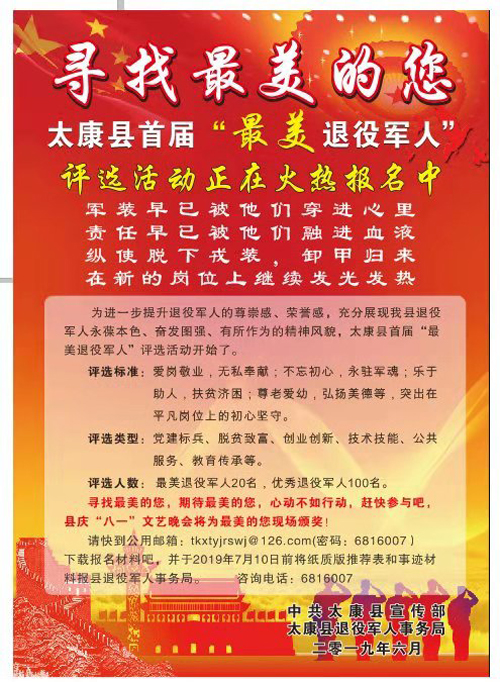 此次活動成立了由縣委常委、宣傳部謝成營任組長,縣委常委、副縣長韓維俊任副組長,相關部門負責人為成員的評選活動領導小組,制定下發(fā)了《太康縣“最美退役軍人”宣傳推介活動實施方案》,明確了評選范圍、評選標準、評選程序和評選要求,動員各鄉(xiāng)鎮(zhèn)、縣直各單位及社會各屆積極推薦、發(fā)現(xiàn)身邊的退役軍人先進典型,認真撰寫事跡材料,做好推薦評選工作。