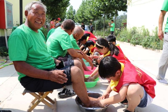 7月的太康,酷熱難耐。6日上午8時(shí)許,一輛公交車穩(wěn)穩(wěn)??吭谔悼h芝麻鄉(xiāng)敬老院門口,車上下來(lái)20多名身穿紅馬甲的學(xué)生志愿者,他們抬著米、面、油和雞蛋等物品走進(jìn)敬老院。坐在門口等候的老人們,樂(lè)呵呵地上前迎接客人。整個(gè)敬老院一下子熱鬧起來(lái)。放下物品,孩子們立馬開始勞動(dòng),他們從老人們宿舍搬出馬扎、板凳,在院中擺放安穩(wěn),扶著老人坐上去,開始給老人洗腳。正上初中一年級(jí)的李博泉細(xì)心地幫72歲的張照志老人摳掉趾甲縫和腳底的污垢。張老漢流淚了:“這輩子有人給我洗腳,我真是不知道哪修來(lái)的福氣……”