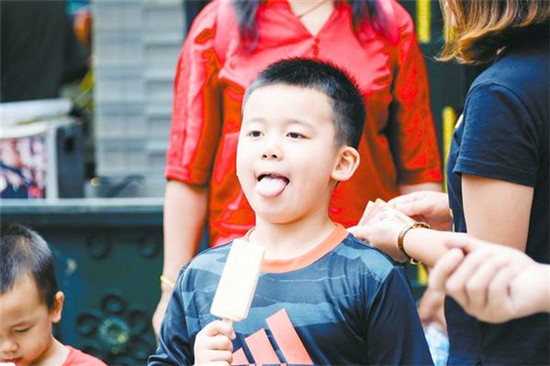 7月23日,一名小朋友拿著冰棍在哈爾濱中央大街游玩。