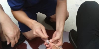 經(jīng)過查看,由于尺寸不合適,該男子左手中指已經(jīng)被戒指卡的出現(xiàn)充血,手指腫脹嚴(yán)重。考慮到用剪切器等器械剪戒指可能會(huì)傷到手指,指戰(zhàn)員利用纏線解線的方法,用細(xì)線穿過戒指在手指上纏繞,然后慢慢拉線,利用細(xì)線的滑潤(rùn)效果幫助取下戒指,很快戒指被成功取下。