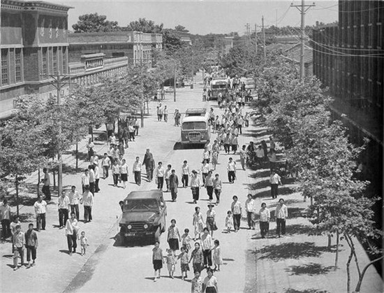 1975年6月,西華縣城唯一的一條硬化路面大街,現(xiàn)在的箕城路。 1975年5月,新華社一名攝影記者來到河南,從鄭州花園口到周口商水、西華、太康、扶溝、淮陽,歷時一個半月采訪拍攝黃泛區(qū)現(xiàn)狀。途徑地政府安排當(dāng)?shù)財z影家與其共同拍攝,周口攝影家葛慶亞、李中華、岳獻甫參與了拍攝。受政治環(huán)境影響,這批圖片推遲到1979年才集結(jié)成冊,由外文出版社分英文、法文、西班牙文三種語言出版。當(dāng)時,外文出版社隸屬出版總署,由中共中央宣傳部領(lǐng)導(dǎo),出版了大量的外宣圖書贈送外國駐華領(lǐng)事館。 (圖片來源:圖書《Former yellow river flood area transformed》中文名《黃泛區(qū)變化》)