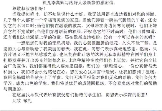 為表示對張新靜等人大代表的感謝,隨后,李高輝給張新靜寫了一封感謝信。信中,他表示,自己一定不辜負(fù)大家的期望,以后會更加努力學(xué)習(xí),回饋社會,回報大家?!八且粋€懂得感恩的孩子,讀了他的來信,我感到很欣慰。”張新靜說。