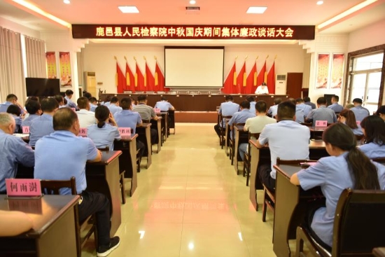 中秋節(jié)、國慶節(jié)即將來臨,為加強(qiáng)節(jié)日期間黨風(fēng)廉政建設(shè),以實(shí)際行動展現(xiàn)檢察隊(duì)伍遵規(guī)守紀(jì)的過硬作風(fēng),9月 9日,鹿邑縣人民檢察院召開中秋、國慶“雙節(jié)”期間集體廉政談話大會。