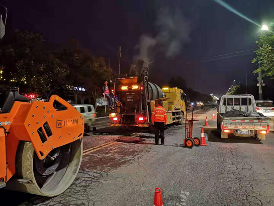 9月20日晚,記者在八一大道北段看到,道路綜合養(yǎng)護車、壓路機、運輸車、圓周切割機等車輛和設(shè)備早已到位,市政工人正在施工(如圖)。從切割路面到恢復(fù)通車,一段路不到兩個小時就完成了任務(wù)。從外觀看,新更換的窨井蓋與以前的并無明顯差別。