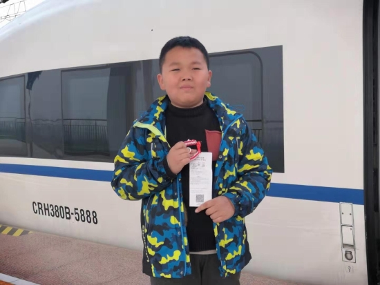 “沒事,不急,我和媽媽一起等俺爸來接?!毙∨笥涯弥约旱母哞F票,讓記者給他拍照留下這次快樂的記憶。