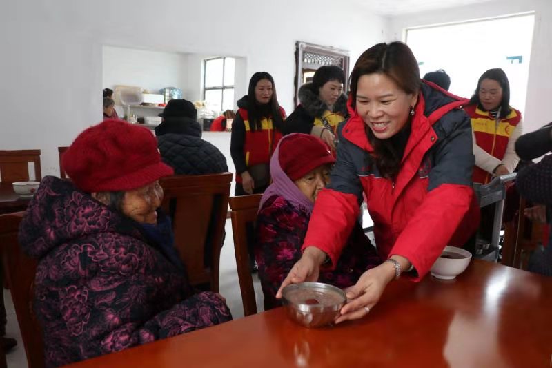 “開飯嘍!”中午時分,志愿者們將老人一一攙扶到餐廳坐下,隨后將一碗碗香氣四溢、且冒著熱氣的八寶粥端到老人跟前?!跋悖嫦?!”80歲的黃柏功老人舀了一勺八寶粥放到嘴里品了品笑著說。吃著八寶粥,老人想起了以前的艱苦生活,他禁不住激動地哭了起來:“以前,吃了上頓沒下頓,想吃一塊白面饃,都得等到過年。可現(xiàn)在,天天不斷肉,生活越來越好。這都是共產(chǎn)黨給咱的福啊。”