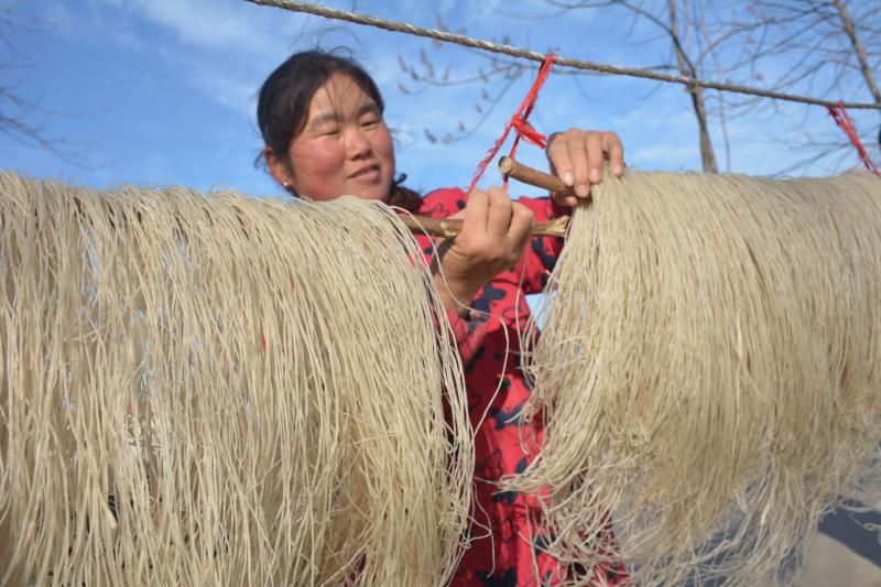 “我們是附近大朱莊村的,承包了30多畝地,主要種植西瓜紅薯等經(jīng)濟(jì)作物,效益不錯(cuò)。今天在程小忠這里加工純手工紅薯粉條,他還承諾幫助我們銷(xiāo)售,俺打心眼里高興啊……”正在晾曬粉條的朱勝民、王秀蓮夫婦一臉興奮。