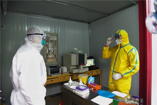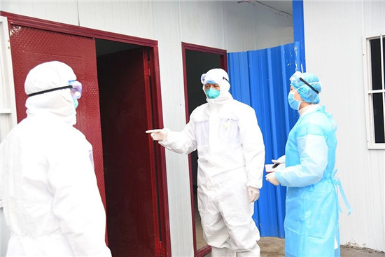醫(yī)院在附近賓館租用25個單間,用于一線醫(yī)務(wù)人員臨時休息,醫(yī)務(wù)人員換班時由專車接送,吃飯由專人派送,確保任何一個環(huán)節(jié)都不會發(fā)生意外感染。 于健、高飛深入隔離區(qū)慰問值班醫(yī)務(wù)人員,對他們舍小家、顧大家,為防疫工作大局、為更多群眾的生命與健康付出的辛苦努力,表示衷心的感謝。