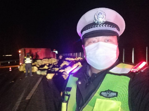 2月15日晚,一輛滿載著蔬菜的大貨車在大廣高速周口轄區(qū)內(nèi)側(cè)翻,一車娃娃菜傾倒在高速路上,占據(jù)了兩個車道,急需救援。市公安局交通管理支隊(duì)高速二大隊(duì)民警接警后迅速救援,幫助運(yùn)送保障物資的司機(jī)先去送貨,再回來處理事故。