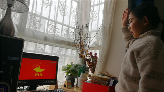 2月25日,周口市文昌小學(xué)三(5)班一名學(xué)生在家中敬隊(duì)禮、唱隊(duì)歌。自新冠疫情發(fā)生以來,周口市文昌小學(xué)通過網(wǎng)絡(luò)授課方式,使孩子們停課不停學(xué)。當(dāng)日,該校組織學(xué)生在網(wǎng)上觀看“河南省少先隊(duì)活動(dòng)抗疫專題示范課”,讓孩子們學(xué)到了很多關(guān)于新冠肺炎的相關(guān)知識(shí)。
