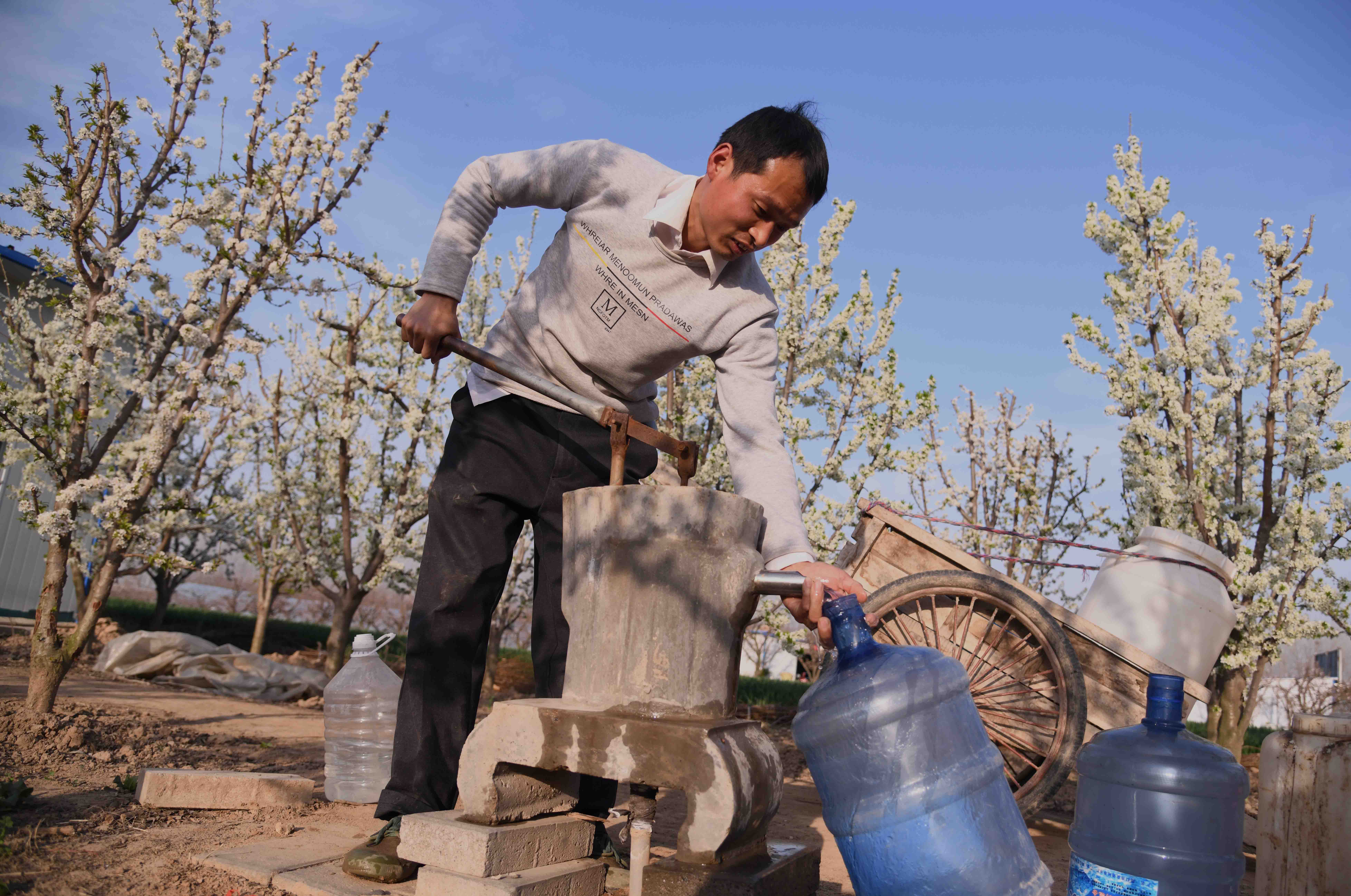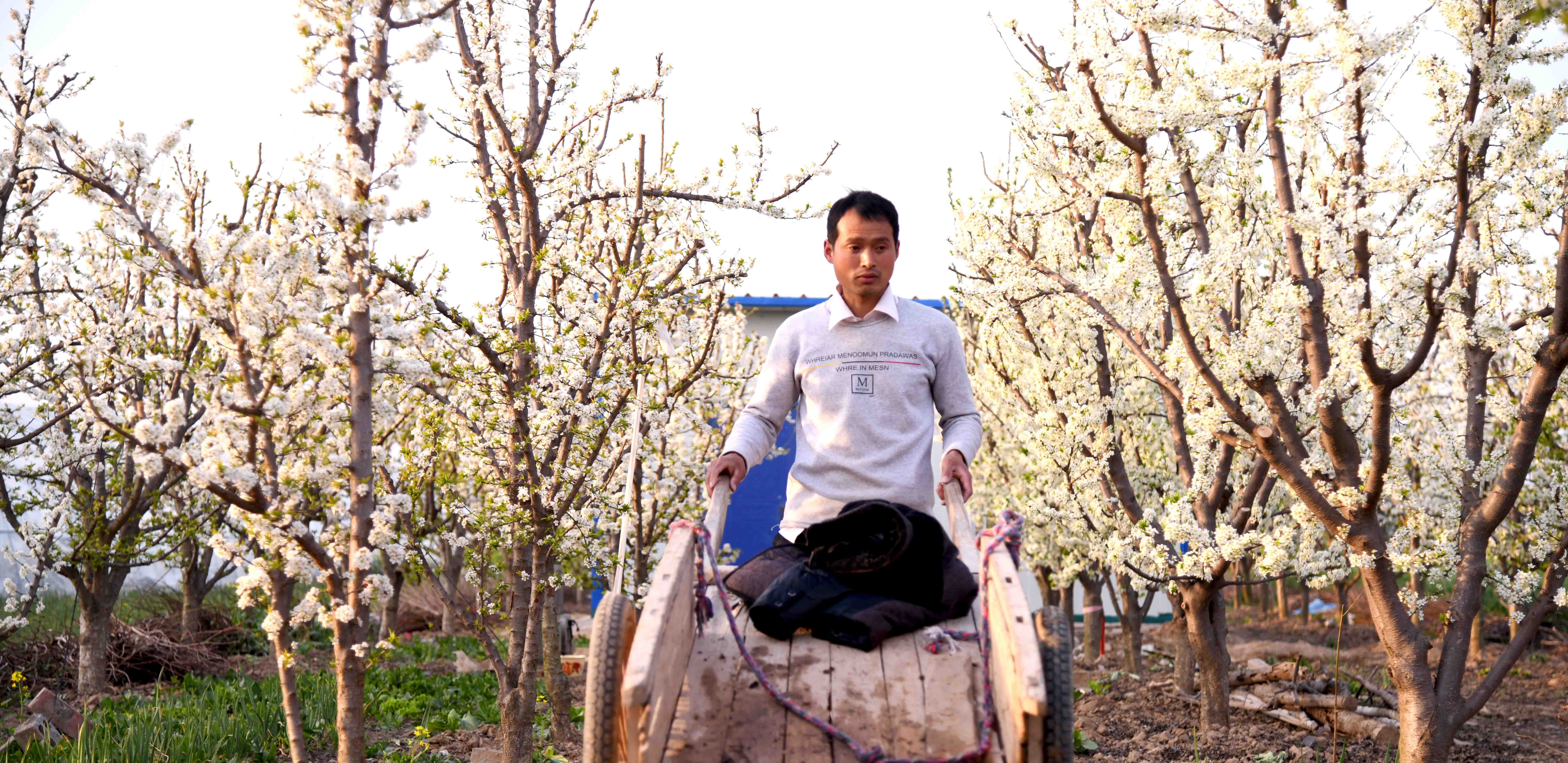 記者在一家果農的果園里看到,果園在春陽下,李子花滿園濃放,滿樹花朵潔白如玉,芳香四溢,宛如置身人間仙境。果農正忙著為果樹澆水,侍弄新栽的果苗。何莊村果園有三四百畝,種植有桃樹、蘋果樹、梨樹、李子樹、柿樹等,是附近有名的果樹種植村,成為村里的重要副業(yè),每年夏秋季節(jié),這里瓜果飄香,吸引很多城里人和附近村民前來購買。
