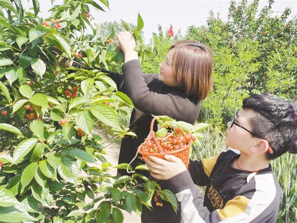 4月26日,在淮陽(yáng)區(qū)豆門鄉(xiāng)武灣村的櫻桃采摘園內(nèi),人們享受著采摘的樂(lè)趣。武灣村農(nóng)民利用地理優(yōu)勢(shì)種植櫻桃、草莓等,吸引附近的民眾前來(lái)采摘,成為當(dāng)?shù)氐奶厣a(chǎn)業(yè)。記者 孫安平 攝