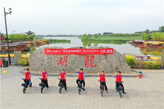 當(dāng)日38度的高溫酷熱擋不住檢察干警守護(hù)淮陽河暢、水清、湖凈、岸綠、景美的決心和信心,30名檢察干警、志愿者騎電車圍湖宣傳,為市民進(jìn)行相關(guān)政策的講解,號召市民熱愛龍湖,告知群眾及社會各界人士參與檢察公益保護(hù)的方式和途徑,公開聯(lián)系電話,微信公眾號,方便群眾通過多種渠道提供案件線索。