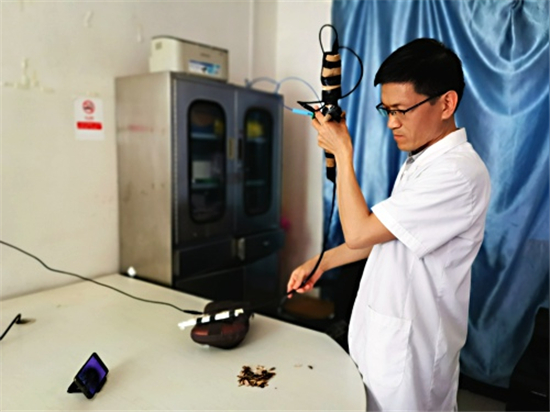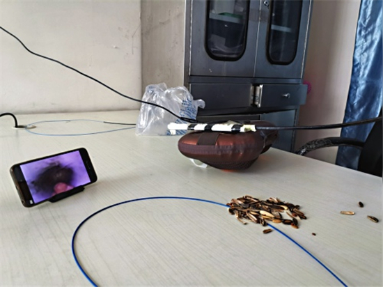 記者看到徐醫(yī)生自制的呼吸內鏡,胸部是用一個家用電動按摩枕代替的,用來能模擬人的胸部呼吸起伏;按摩枕上固定了兩個用打印紙卷成的小紙筒,用來代替氣管;屏幕是用手機代替的,用WIFI和氣管鏡鏈接,影像可以通過手機屏幕看到;內鏡手柄是徐醫(yī)生用膠泥結合真實設備形狀、重量捏制而成的。當著記者的面,徐醫(yī)生把一小半瓜子皮放入模擬人體氣管的紙筒,在手機屏幕的導航下通過氣管鏡到達異物所在位置,熟練地用異物鉗夾出異物。