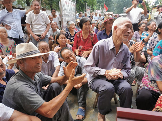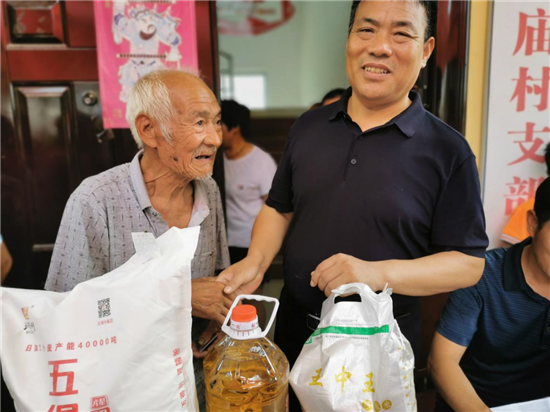 發(fā)放儀式開(kāi)始后,村干部負(fù)責(zé)發(fā)放,老人們有序領(lǐng)取,個(gè)個(gè)興高采烈,歡笑聲響徹在邵廟村的上空……