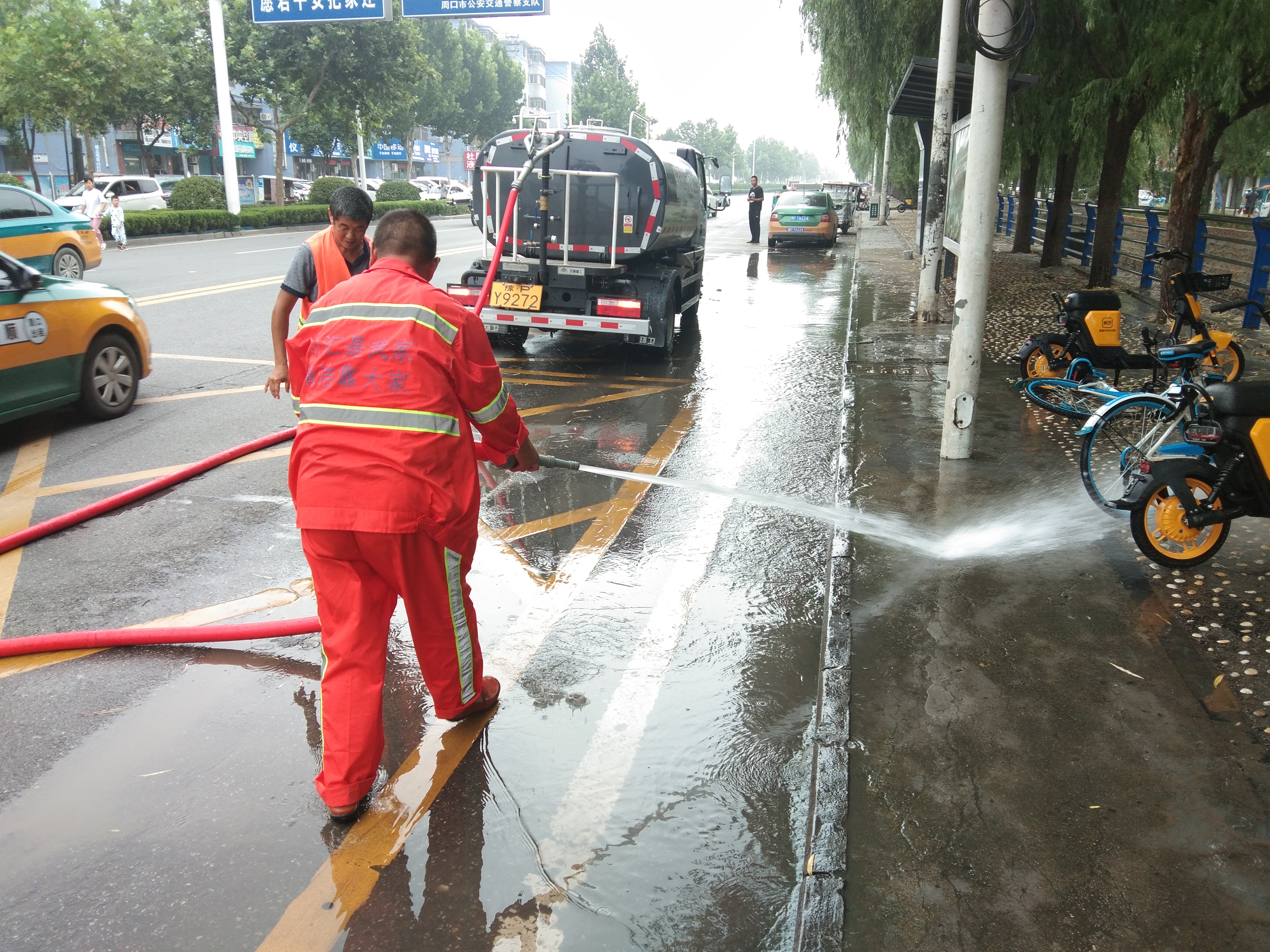 8月23日上午,記者在周口中心城區(qū)大慶路與交通大道交叉口附近看到,工作人員正在對一些人工難以清掃干凈的路面進(jìn)行高壓沖洗作業(yè),為“創(chuàng)衛(wèi)”貢獻(xiàn)力量,讓市民有一個良好出行環(huán)境。