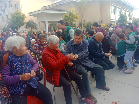 爺爺奶奶的開心也感染得孩子們更加雀躍,親自給老人們剝花生、送糖果,分享快樂,開心不已。