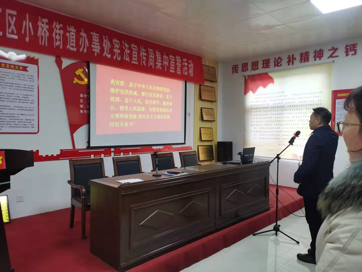 國(guó)歌響起,全體人員起立唱國(guó)歌。隨后,小橋街道辦事處黨工委書記侯明亮左手撫按憲法,右手舉拳,領(lǐng)誦誓詞,其他宣誓人跟誦誓詞。宣誓后,侯明亮對(duì)開(kāi)展好憲法宣傳周宣傳活動(dòng)、學(xué)習(xí)黨的十九屆五中全會(huì)精神和習(xí)近平總書記關(guān)于憲法的重要論述做了具體安排部署,要求大家要結(jié)合當(dāng)前工作實(shí)際,做到依憲施政、依法行政,進(jìn)一步提高尊法學(xué)法守法用法意識(shí)。