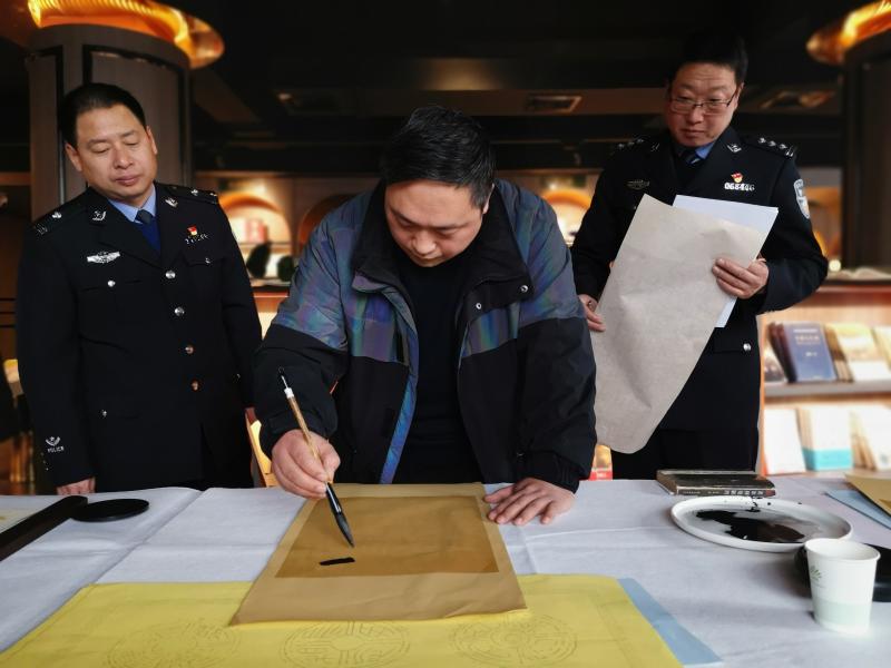 1月10日下午,沽讀書廊二樓翰墨飄香、筆鋒頓挫。為慶祝首個(gè)中國(guó)警察節(jié),書法家李為、何巖、陳濤、游富華、何祥峰、李雯云、軒敬賢以及祁庚鑫等一行,為川匯區(qū)公安分區(qū)民警義寫書法作品,送來(lái)一份特殊的節(jié)日禮物。