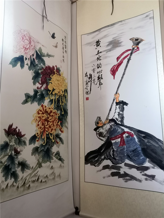 在建豪工作室的斜對面,是50歲村黨支部書記、村文聯(lián)主席盧全禮的書畫工作室。盧全禮書畫兼擅,還會武術(shù)、木刻、舞獅子,是附近有名的才子。記者看到,他為太康縣第二屆農(nóng)民豐收節(jié)創(chuàng)作的中國畫《黃土地的心聲》,以該村嗩吶吹奏藝人幸福而夸張的演出情景,歌頌農(nóng)村脫貧攻堅取得的巨大成果,極具鄉(xiāng)土氣息。在他的畫室,滿身文藝范兒的五西村民,正以新時代松鶴延年吉祥農(nóng)民畫,齊心打造中原畫鶴第一村。經(jīng)過培訓(xùn)的農(nóng)村大嫂大媽執(zhí)筆齊描畫,一時鶴鳴九皋,翩翩欲飛。