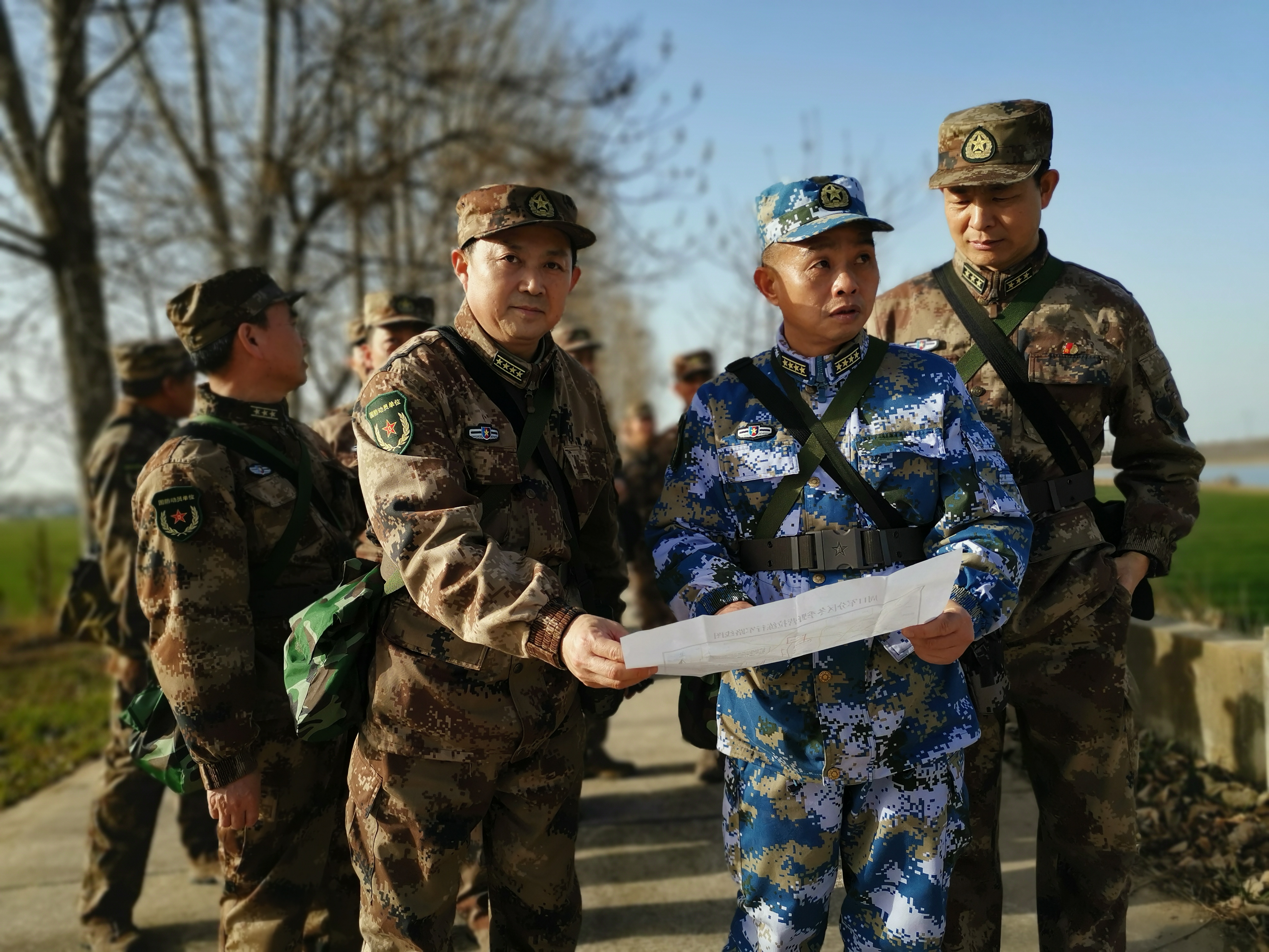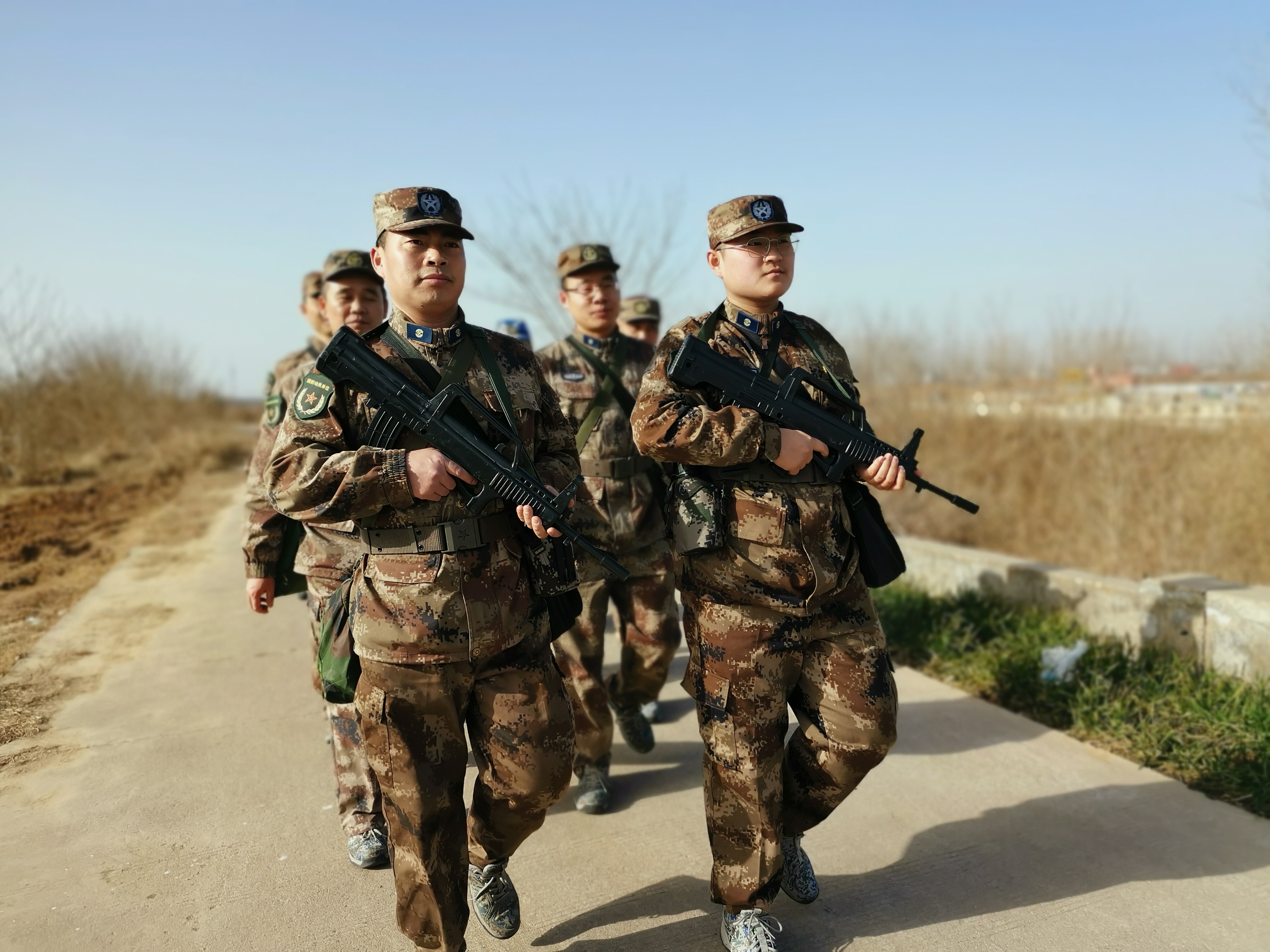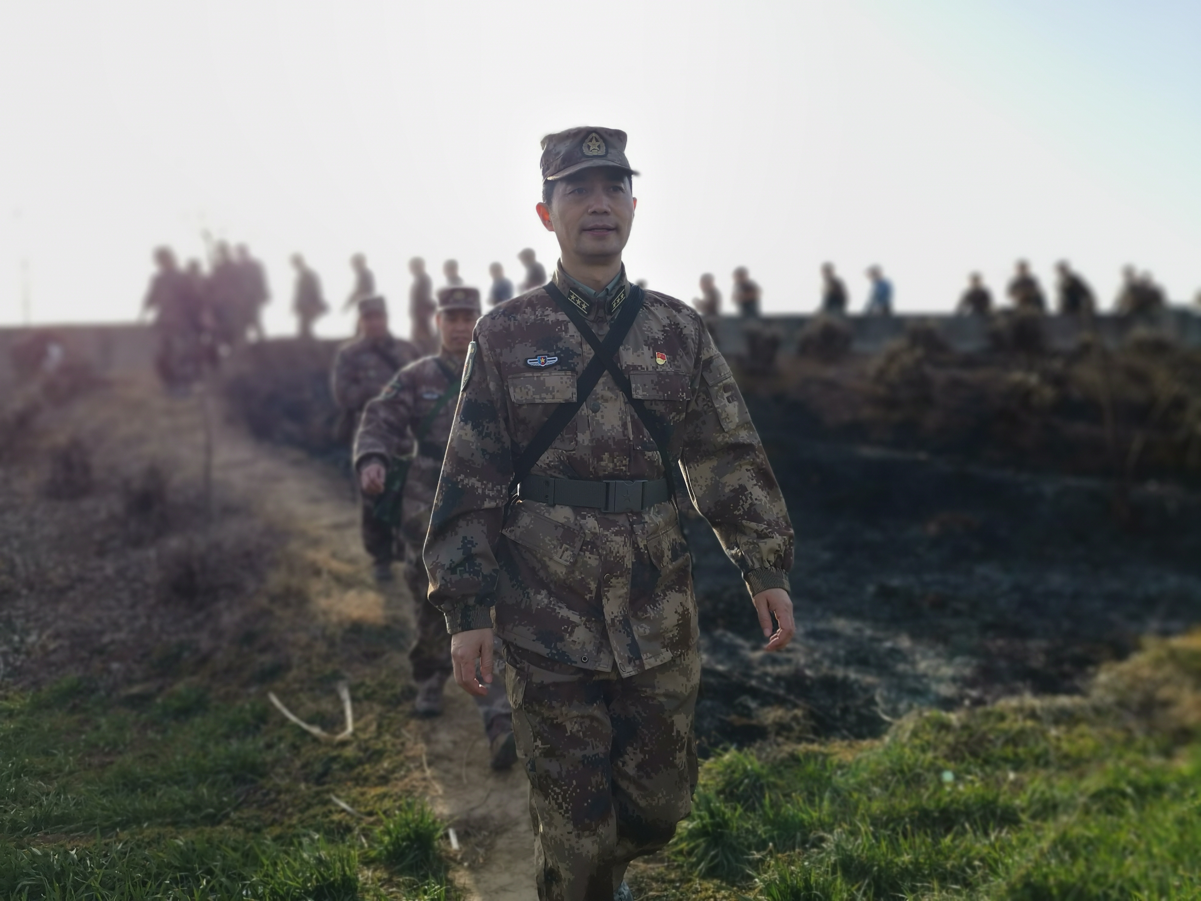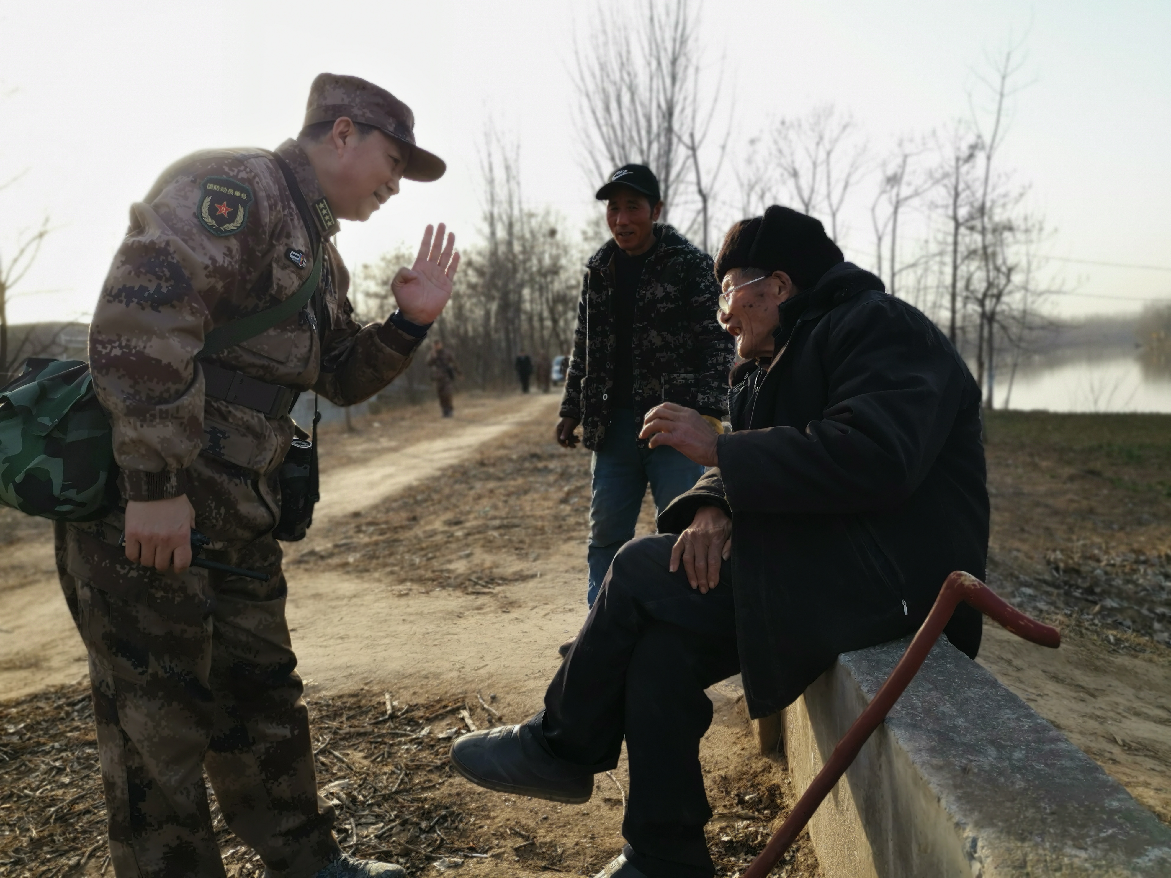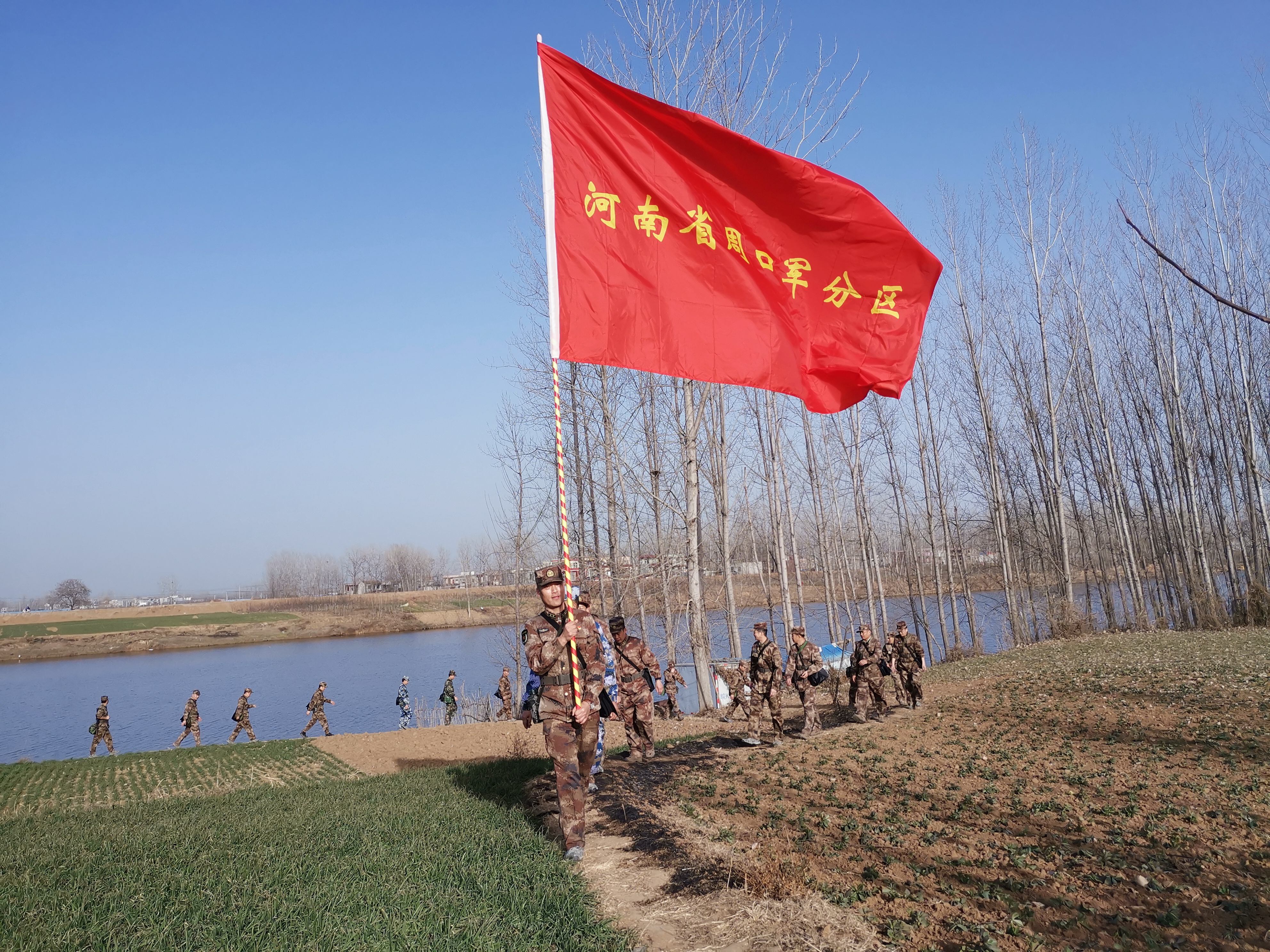 冬日暖陽里,沙潁河畔,一群迷彩身影行走在蜿蜒曲折的沙河堤上。陽光下,“河南省周口軍分區(qū)”的旗幟迎風(fēng)飄揚(yáng)。