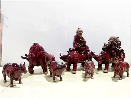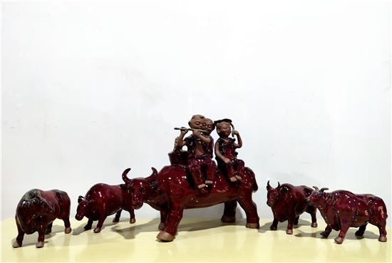 春節(jié)前夕,鄲城泥塑大師張振福歷時多日制作一組鈞瓷泥塑群雕《瑞牛賀新春》。該組作品分為三頭長約90厘米的大牛和若干頭小牛,均為鈞瓷泥塑,采用豫東黃泥和粗獷手法制作,上釉時入窯一色,歷經(jīng)1200多攝氏度高溫?zé)坪蟪龈G萬變,十分精彩。拓荒牛精神,展現(xiàn)中國人自立自強(qiáng)的志氣;孺子牛精神,體現(xiàn)在創(chuàng)造美好生活的時代課題中;老黃牛精神,貴在“心有大我、至誠報國”的奉獻(xiàn)品格。