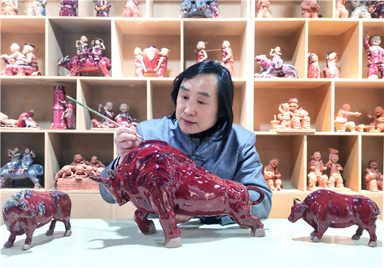 張振福制作鈞瓷泥塑“瑞牛賀新春”
